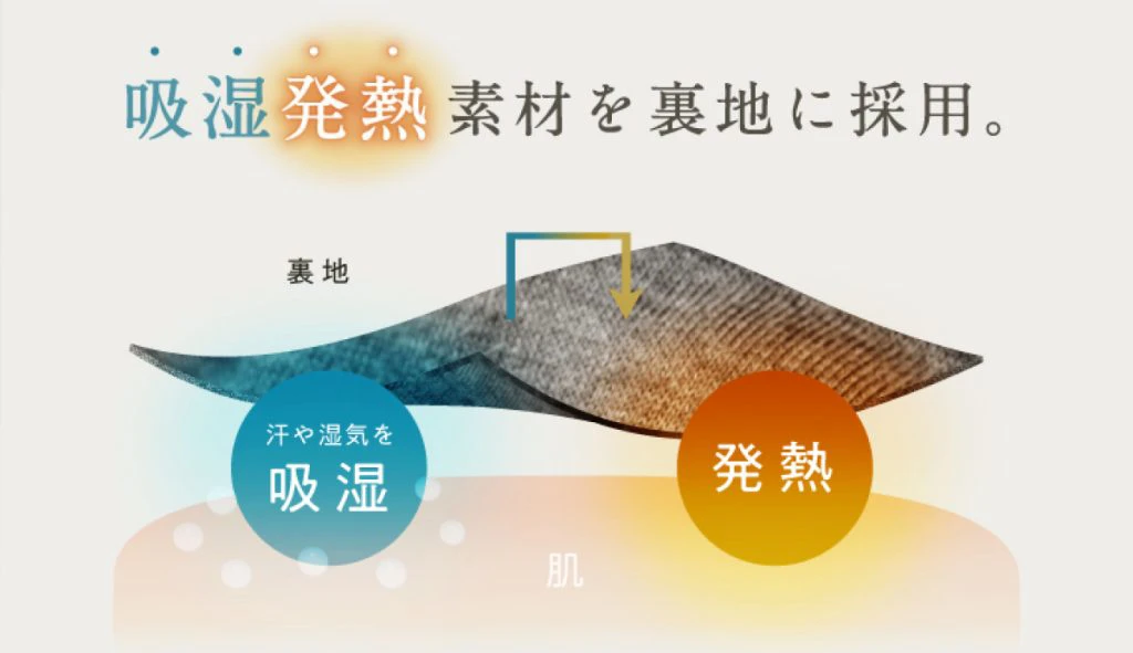 寝返りを妨げない厚すぎない生地は、表地で冷たい空気を遮断し、裏地には汗や湿気を吸水することで発熱する吸湿発熱素材を採用。